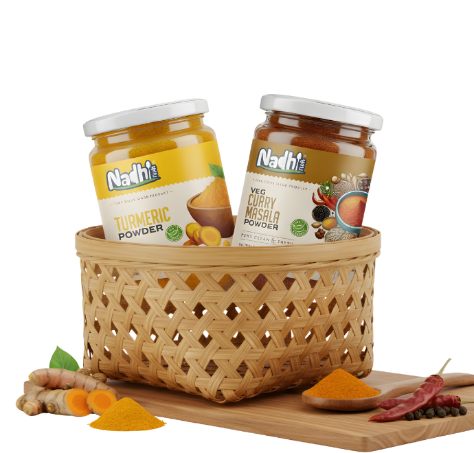 Nadhi Foods brings traditional, homemade taste to modern kitchens. Made fresh on order, our range includes organic vegetables, oils, masalas, chutneys, batters, and flours, pure, hygienic, and trustworthy.